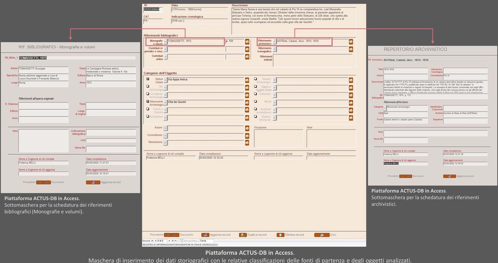 - Scheda base ossia Registro di informazioni storiografiche in chiave cronologica (in ambiente Microsoft Access, Roma Tre DArc) con relativo manuale di compilazione (rielaborazione autonoma, sulla base della normativa e dei modelli schedografici ICCD opportunamente rivisitata e implementata in chiave relazionale). La scheda base consente di registrare singole informazioni desunte dalla letteratura scientifica o dai repertori archivistici e iconografici, senza alcuna mutazione dalla semenza originaria, schedandole in base all’oggetto a cui si riferiscono